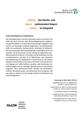 Mit einem Vortrag zum Thema „Justiz und Zivilprozess im Föderalismus“ setzte die Initiative Rechts- und Justizstandort ihre neue Veranstaltungsreihe „Talking about Justice – Der Rechts- und Justizstandort Bayern im Gespräch“ fort. Gastgeber war diesmal das Munich Center for Dispute Resolution (MuCDR) an der Ludwig-Maximilians-Universität München.