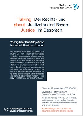 Mit einem Vortrag zum Thema „Volldigitaler One-Stop-Shop bei Immobilientransaktionen“ startete die Initiative Rechts- und Justizstandort Bayern ihre neue Veranstaltungsreihe „Talking about Justice – Der Rechts- und Justizstandort Bayern im Gespräch“ in den Räumen des Bayerischen Notarvereins e.V. in München. Ziel der Veranstaltungsreihe ist es, unter dem Dach der Initiative Impulse für fachlichen Austausch zu geben sowie sich intern und extern weiter zu vernetzen. Jede Folge der Reihe mit geplant ca. zwei Veranstaltungen pro Jahr wird organisatorisch und inhaltlich abwechselnd von verschiedenen Mitgliedern der Initiative verantwortet.