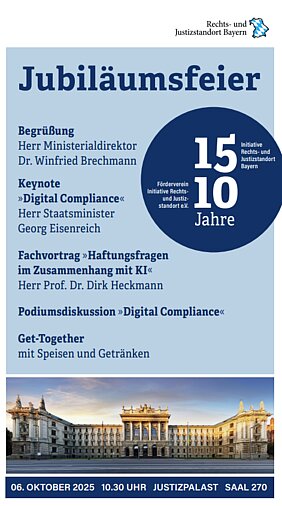 Die Initiative Rechts- und Justizstandort Bayern feierte am 6. Oktober 2025 ihr 15-jähriges Bestehen sowie die Gründung des Fördervereins vor zehn Jahren im Rahmen einer Jubiläumsveranstaltung.